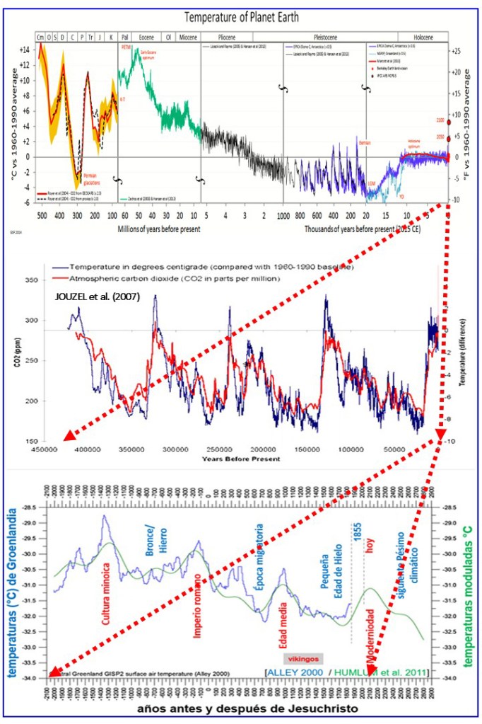 La grafica intermedia de esa misma Figura 1 corresponde a los últimos 425.000 años, una mínima porción en el extremo derecho de la gráfica anterior, donde se aprecian perfectamente cuatro ciclos de enfriamiento (glaciaciones) y periodos de calentamiento (periodos interglaciares). Desde la perspectiva de ese periodo, en el momento actual nos encontramos en una etapa de calentamiento, muy probablemente acercándonos al final de una etapa interglaciar, con temperaturas similares a las etapas interglaciares anteriores. Por último, la gráfica inferior representa la evolución térmica registrada en una etapa ya histórica, correspondiente a los últimos cuatro mil años. Como puede observarse, el momento actual corresponde también un periodo de calentamiento, posterior a la denominada Pequeña Edad de Hielo y donde las temperaturas son del mismo orden o incluso inferiores a las registradas en periodos anteriores, como fueron las etapas cálidas correspondientes a la Cultura Minoica, la Época Romana y la Edad Media. Así pues, se puede afirmar categóricamente que las oscilaciones térmicas han sido la norma en la historia del planeta (cualquiera que sea la escala temporal considerada) y que las temperaturas actuales, que están muy por debajo de los valores térmicos alcanzados en etapas anteriores (cuando no pueden ser atribuibles a las actividades humanas) no representan valores anómalos ni críticos.