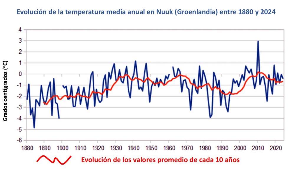Además, como se puede apreciar en las tres gráficas de la Figura 1, la evolución de la temperatura está muy lejos de ser lineal. Por ello, tan sólo las tendencias a largo plazo permiten establecer los ciclos de calentamiento y enfriamiento, siempre de forma relativa y de acuerdo con la duración de los ciclos temporales considerados, siendo muy frecuentes las oscilaciones, avances y retrocesos de corta duración. Por eso, como hemos visto muchas veces en las noticias, las temperaturas máximas que se alcanzan en la actualidad ya tenían precedentes hace varios siglos o, incluso, varias décadas atrás. La Figura 4 muestra la evolución de la temperatura en una de las zonas más sensibles al cambio climático, en Groenlandia, donde se puede apreciar los bruscos altibajos de temperatura, y donde sólo la pendiente a largo plazo muestra una tendencia ascendente al calentamiento.