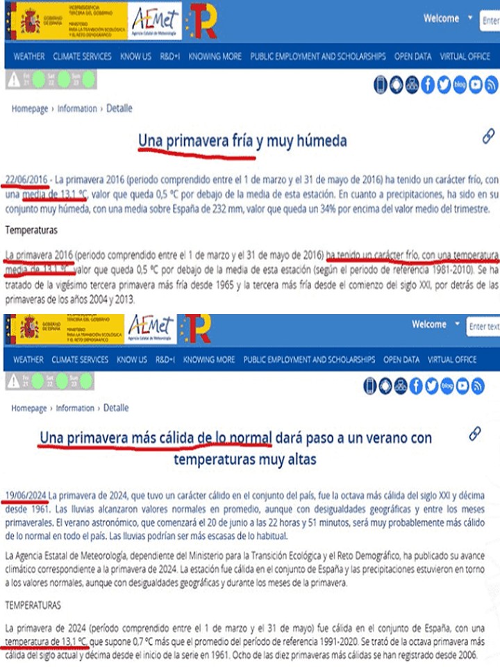 En la parte superior se informa que la primavera de 2016 ha sido fría, con una temperatura de 13,1ºC, medio grado por debajo de la media. Ocho años más tarde, con un valor idéntico, la primavera de 2024 fue calificada como más cálida de lo normal. Ante las críticas recibidas, AEMET se justificó diciendo que la coincidencia de temperaturas entre ambos años era sólo aparente, ya que en 2020 se había cambiado el periodo de referencia para calcular la temperatura media de cada año. Pero la coincidencia no era aparente, porque 13,1ºC era el valor realmente obtenido en ambos casos y lo que se había cambiado era el criterio comparativo. Es decir, en lenguaje llano, que se habían seleccionado los intervalos temporales de registros a considerar para que los datos fríos pasasen a ser cálidos y mantener el relato climático. La comparación entre las dos gráficas de la Figura 2 ilustra claramente las distorsiones que se pueden generar mediante la aplicación de este tipo de maniobras estadísticas.