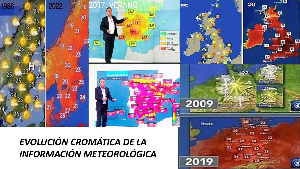 Además, para aderezar debidamente el carácter atemorizante del relato, estas manipulaciones informativas han venido acompañadas de una evolución en el lenguaje con una tendencia marcadamente catastrofista, pasando del cambio climático a la crisis climática y al infierno climático. Aún más intimidatorias han sido las calificaciones que reciben las noches de calor estival, pues han pasado de la tradicional denominación de bochorno, a noches tropicales, noches ecuatoriales y noches infernales. La evolución del léxico ha ido acompañada de un drástico cambio en el lenguaje gráfico. Como puede verse en la Figura 7, los mapas de temperatura de los informativos en la mayor parte de los países europeos han experimentado un radical cambio cromático, pasando a utilizar colores tórridos y ardientes para idénticos rangos de temperatura.