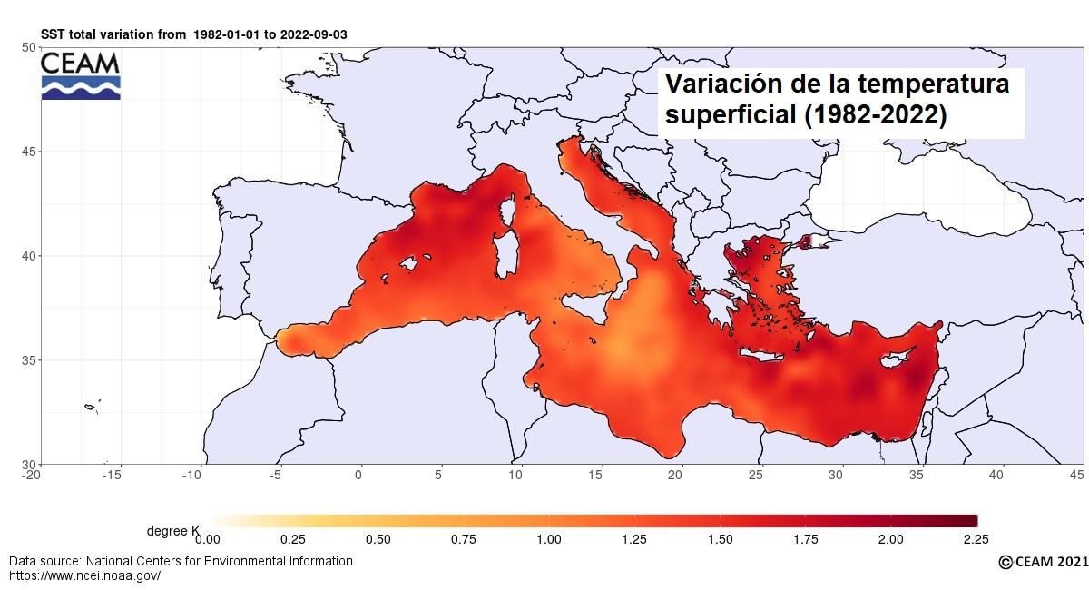 Como no puede ser de otra manera, las variaciones de la temperatura del planeta afectan también a las aguas de mares y océanos, que se ven sometidas a las mismas fluctuaciones reflejadas en las gráficas de la Figura 1. Por lo tanto, el incremento de la temperatura del agua y sus valores actuales, del mismo modo que ha sido ya comentado para la temperatura planetaria, no representan valores anómalos ni críticos, en contra de las noticias alarmistas que nos asaltan por doquier, especialmente en verano. La principal estrella invitada de estas distorsiones informativas es siempre el Mediterráneo, al que se suele presentar también con colores incendiarios, tal y como se muestra en la Figura 8. Sin embargo, según la información que proporciona el sistema de boyas del Array of Real Geostrophic Oceanography (ARGO), el más moderno del que se dispone en la actualidad, el ritmo de calentamiento del Mediterráneo es ínfimo, tan sólo 0,04ºC al año (cuatro centésimas de grado), sujeto al mismo ritmo de oscilaciones que la temperatura media del Planeta. Sin embargo, durante el periodo estival es frecuente escuchar informaciones afirmando que el Mar mediterráneo hierve, cuando su temperatura alcanza los 28ºC.