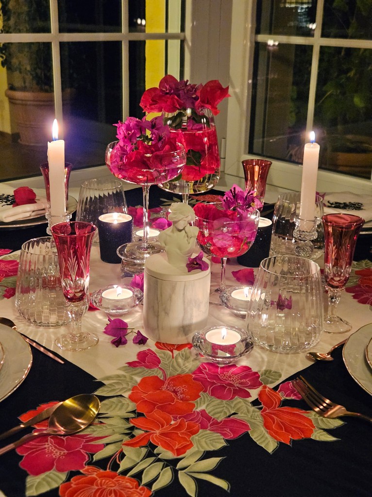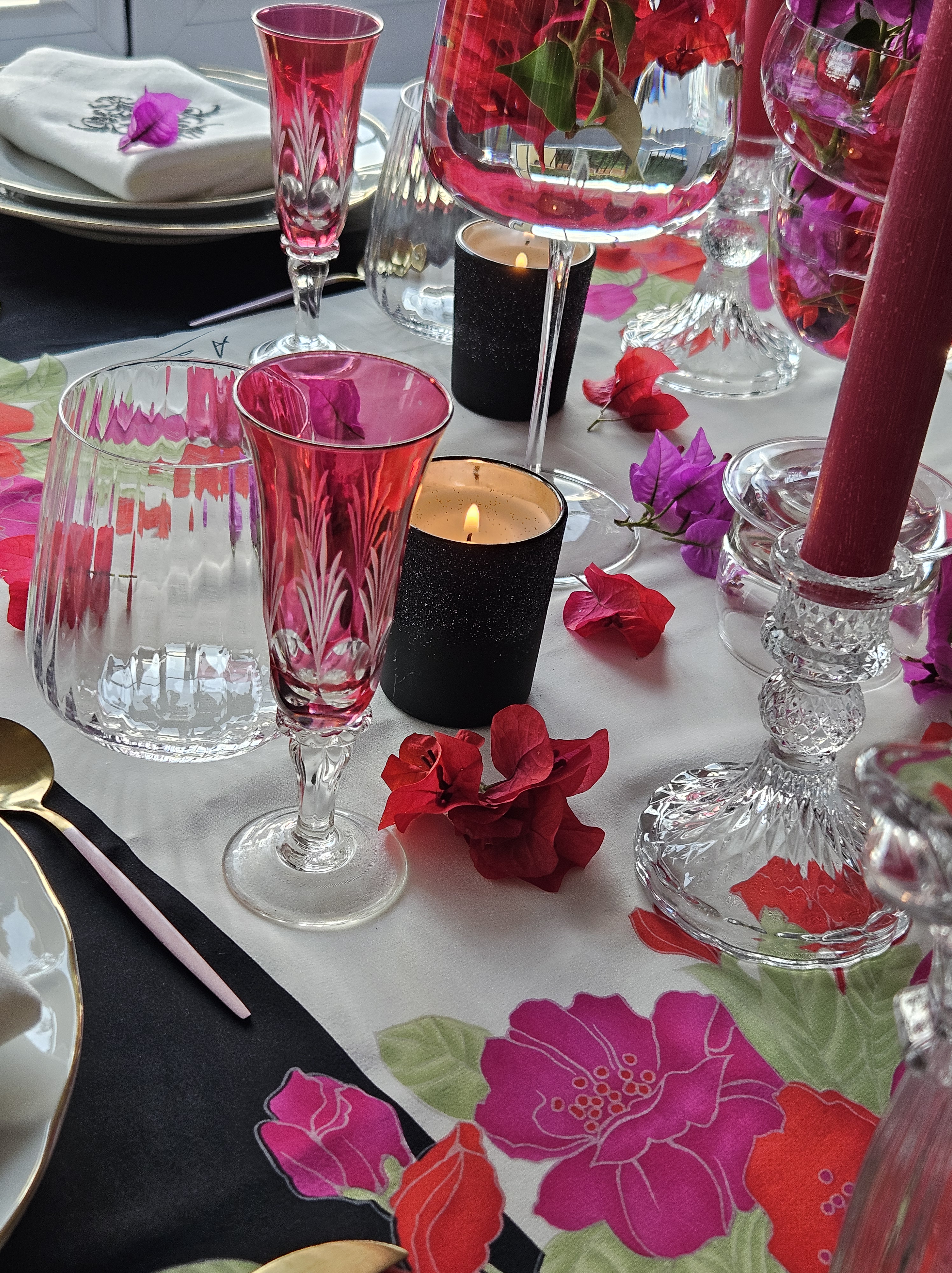 La mesa se rinde al embrujo del color con un pañuelo de seda que cautiva a primera vista: bordes negros que encuadran flores en rojo y fucsia como un estallido vibrante sobre la suavidad de la tela. En el centro, tres copas de cristal de distintas alturas elevan flores de buganvilla que repiten la intensidad cromática con gracia. Una diminuta figura neoclásica, serena, observa desde la penumbra. Realza la vajilla blanca, contrasta con servilletas bordadas en negro, y una copa de licor fucsia añade un guiño atrevido. Todo bajo la luz tenue de las velas, que acarician la belleza y elegancia de la seda.