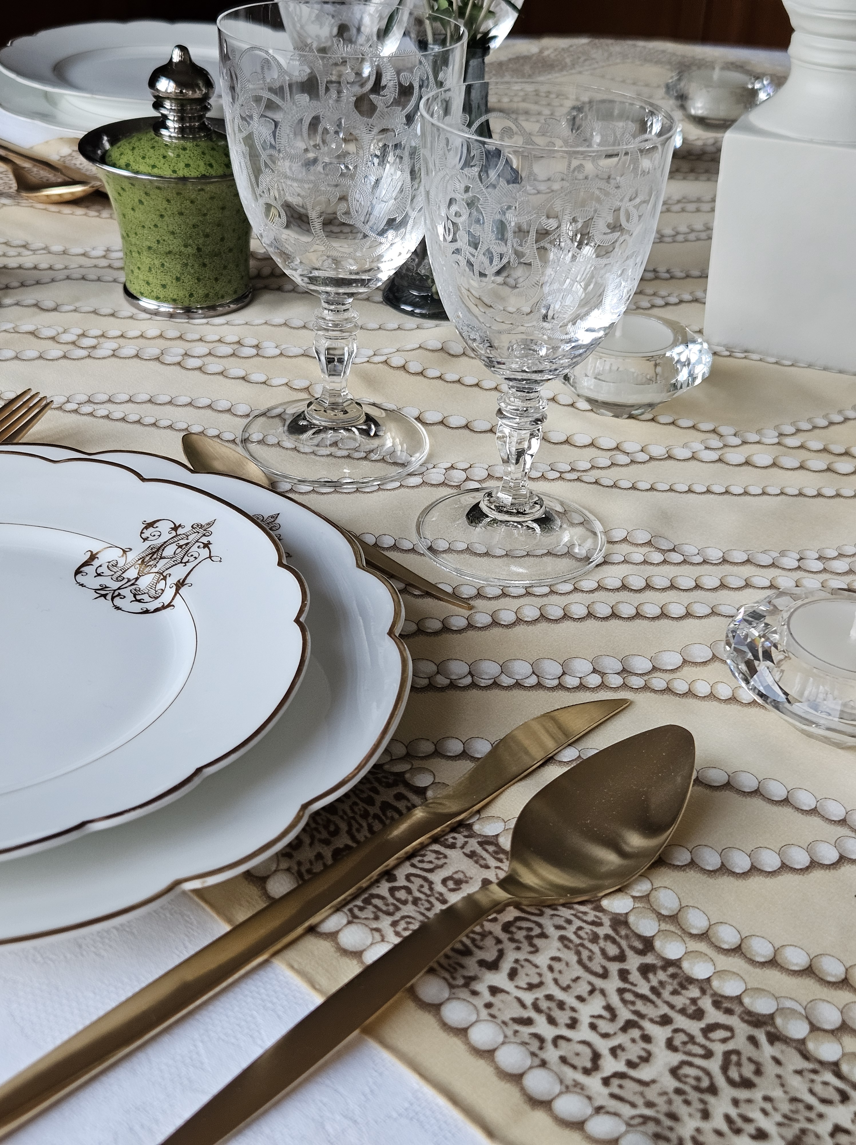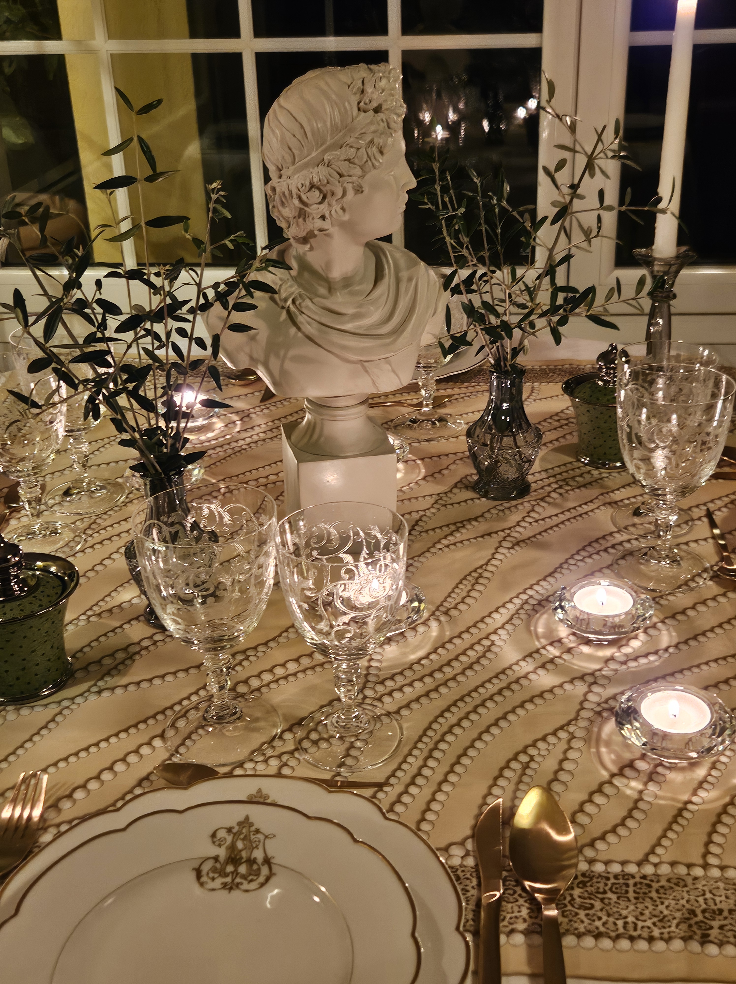 La seda toma el centro de la escena con un pañuelo que combina la pureza del blanco con la sutil opulencia de un diseño que evoca collares de perlas dispuestos en hileras delicadas. En los bordes, una tira con animal print en tonos marrones añade un guiño audaz y refinado. La figura de un busto griego, sereno y clásico, preside el centro, acompañado por sencillos ramos de olivo que aportan frescura y simbología. La cristalería modelo Versalles armoniza con la vajilla vintage, con borde dorado e iniciales grabadas, habla de herencia y cuidado. Las velas encienden la escena con una luz suave, realzando texturas y acentos con armoniosa elegancia.