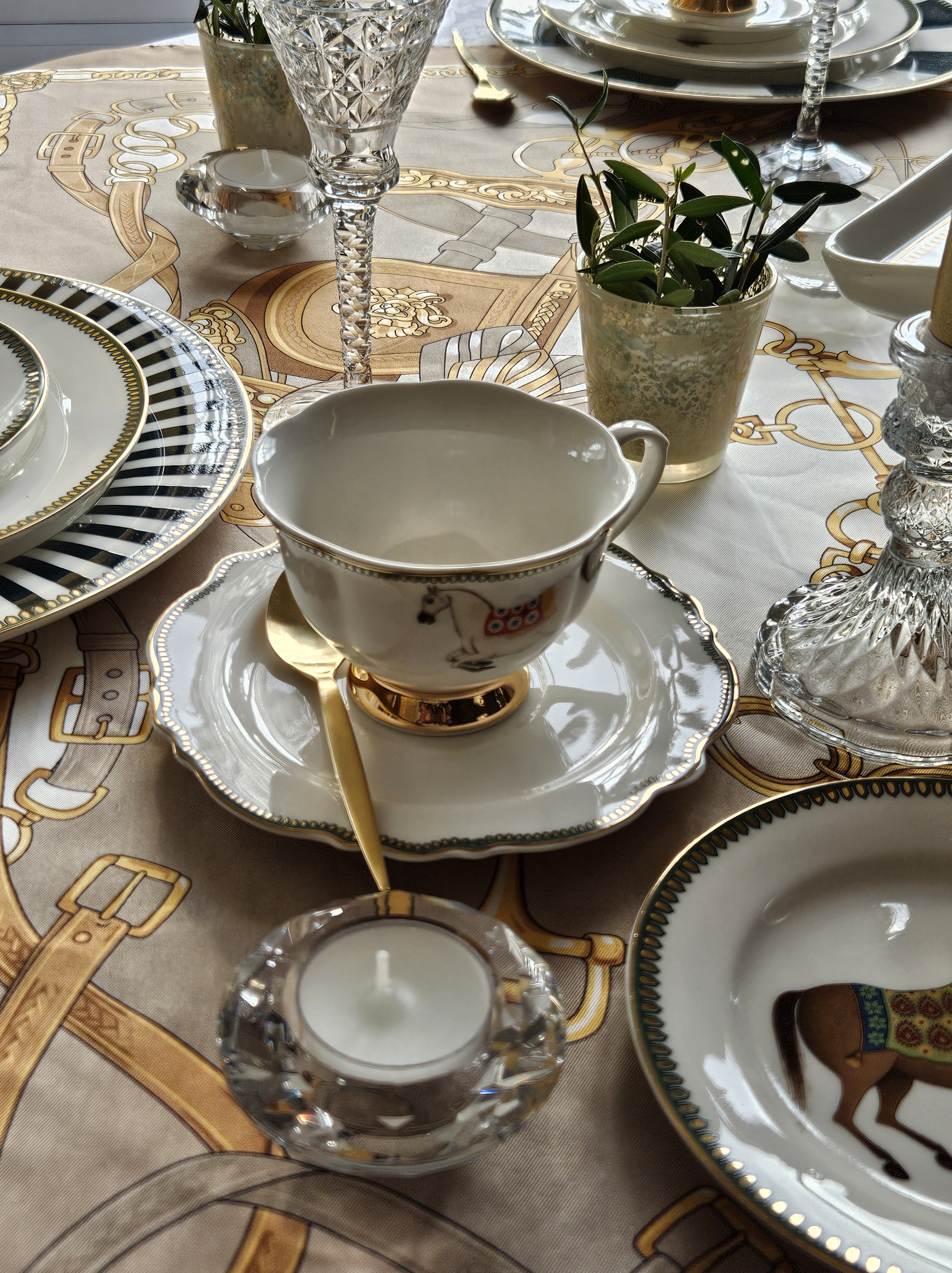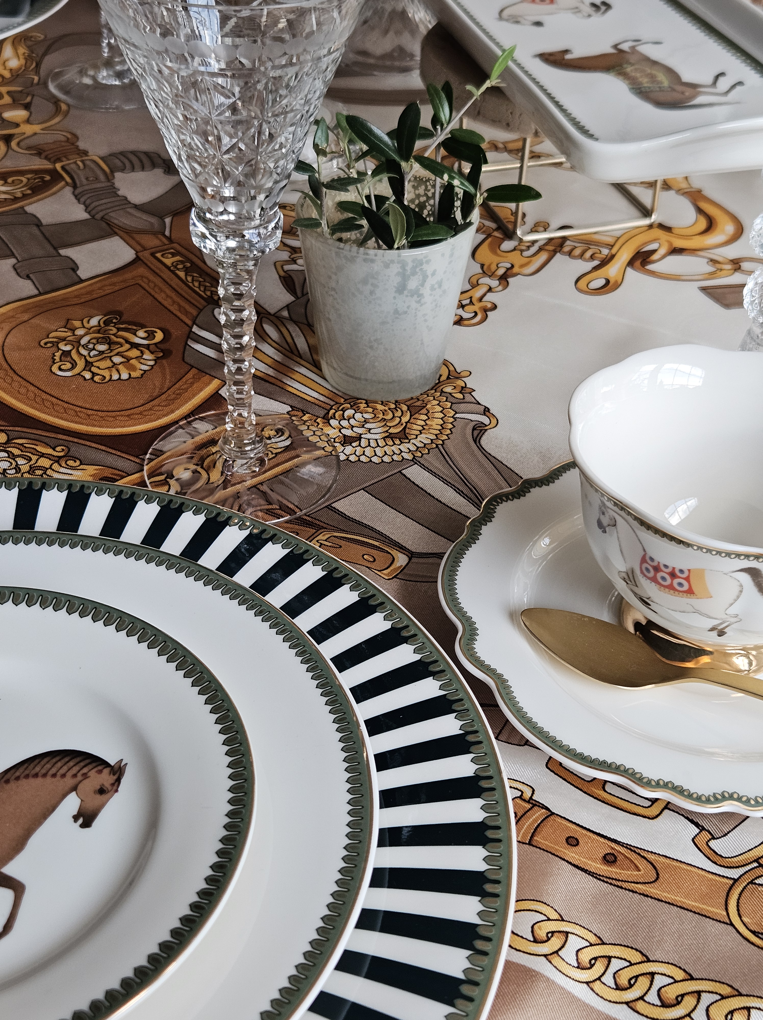 La mesa se viste con un pañuelo de seda que evoca la elegancia ecuestre. Su diseño, inspirado en los aparejos de caballería, despliega estribos, riendas, monturas y lazos entrelazados con armonía, en tonos dorados, marrones sobre un fondo marfil. Cada detalle recuerda la nobleza del caballo, símbolo de libertad y distinción.
