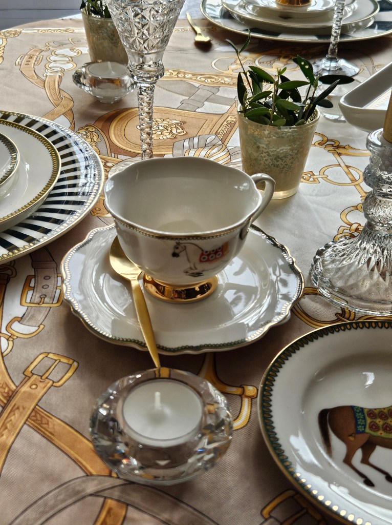 Sobre este exquisito mantel de seda, un juego de té de porcelana, decorado con delicadas ilustraciones de caballos en movimiento, aporta un aire de sofisticación y aventura. Las tazas, finas y delicadas, parecen contar historias de cabalgatas y paisajes lejanos. La luz de la tarde se filtra suavemente, resaltando los reflejos del pañuelo y el brillo del té humeante. Cada sorbo es un viaje, cada elemento en la mesa es un tributo a la belleza ecuestre. En este rincón, el tiempo parece detenerse, invitando a disfrutar la elegancia de la tradición.