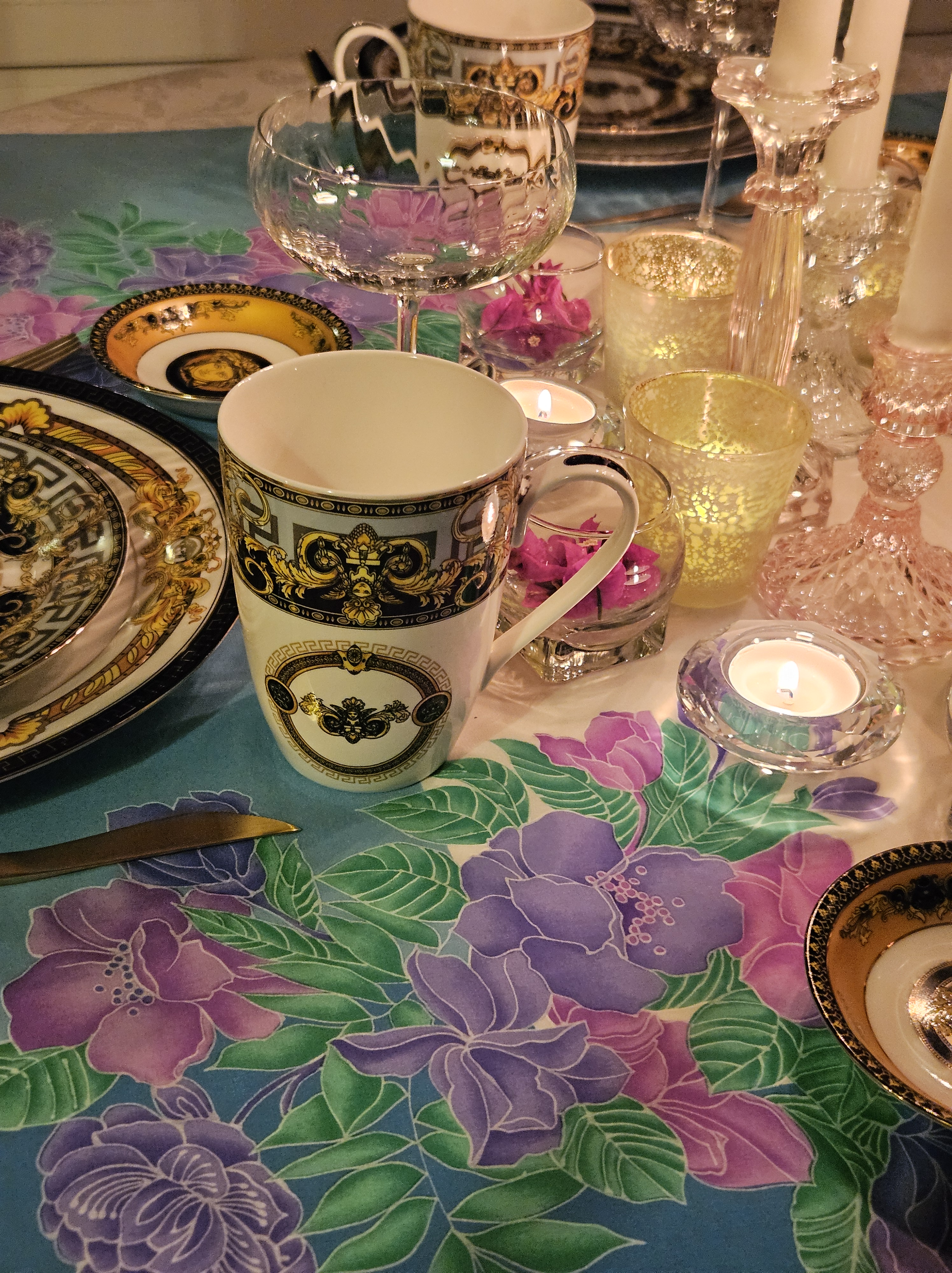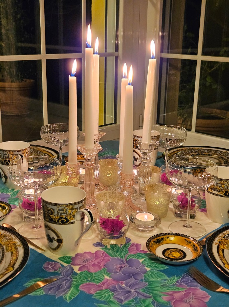 Este pañuelo es la joya que da vida a la escena, realzando con sutileza la exquisita vajilla de Versace que lo acompaña. Los mugs y platitos de pan, decorados con detalles dorados, dialogan en perfecta armonía con la paleta cromática y la textura de la seda. En el centro, una corona de velas aporta una luz cálida que baña cada rincón, elevando la mesa a un espacio de pura distinción y encanto.