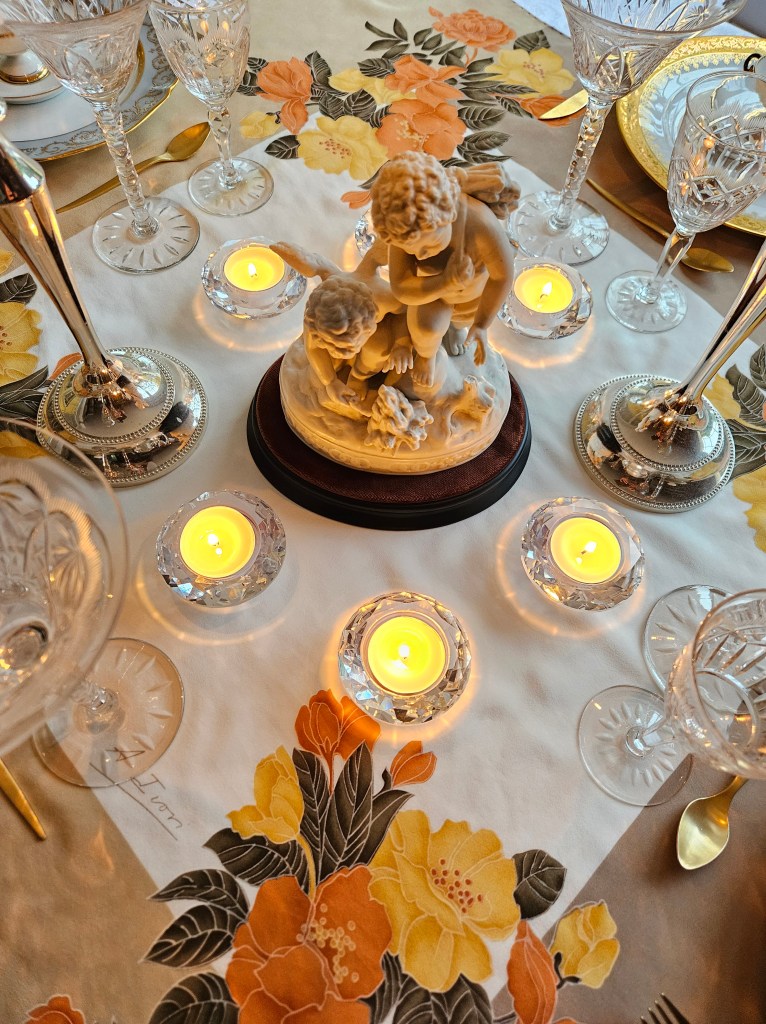Esta mesa se cubre con un pañuelo de seda en cálidos tonos tostados, donde florecen amarillos suaves, naranjas intensos y hojas en matices de marrón. Todo en él evoca la calidez del tiempo detenido. En el centro, una figura neoclásica de dos angelitos recogiendo leña parece narrar una escena antigua, serena y entrañable. La vajilla vintage, de alma nostálgica, combina platos distintos con distintos guardas ornamentales que evocan encajes victorianos y filigranas florales. Sobre cada plato, una pequeña taza de moka. La luz temblorosa de las velas acaricia cada forma, y la seda, silenciosa, guarda historias que solo el alma percibe.