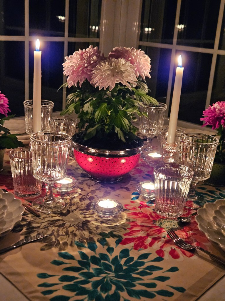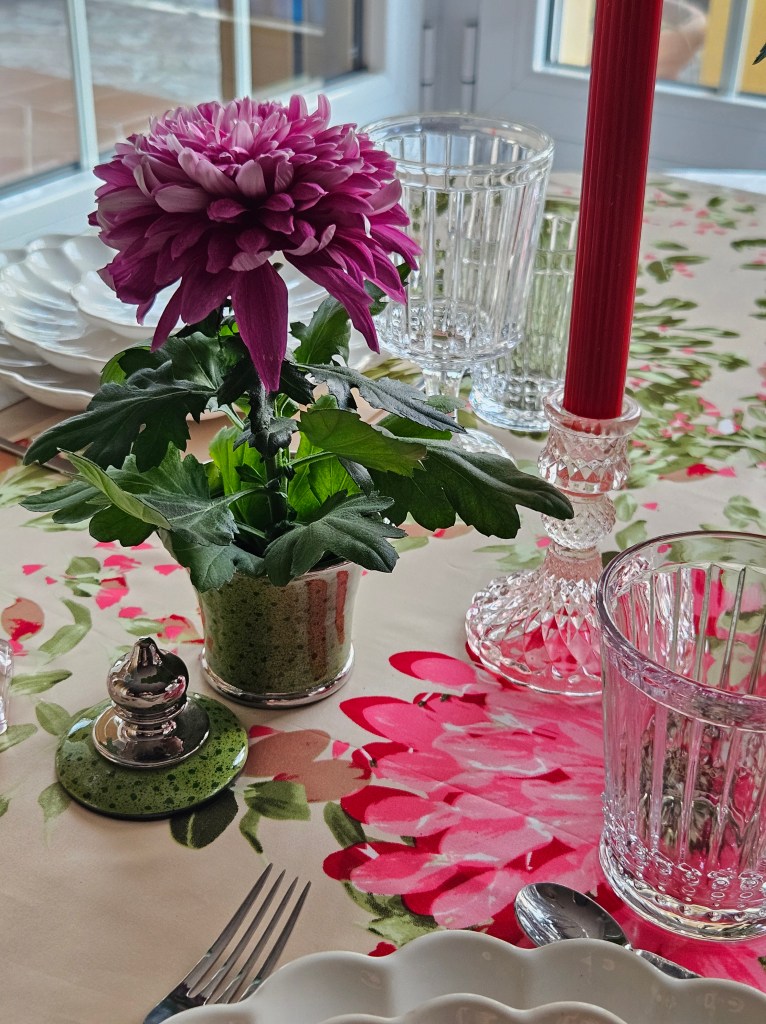 La mesa florece con un pañuelo de seda donde las dalias estallan en una sinfonía de colores: turquesas frescos, corales encendidos, rosas suaves y verdes que acarician la vista. Este jardín de seda se convierte en mantel y corazón de la escena. Al centro, un macetero rebosante de dalias naturales, acompañado por dos más pequeños, prolonga el encanto floral sobre la mesa. La vajilla modelo Dalia se funde con el diseño, creando un diálogo perfecto entre porcelana y tela. Velas dispersas entre las flores encienden una atmósfera tibia, íntima. Es un romance de color, de luz, de pura belleza compartida.