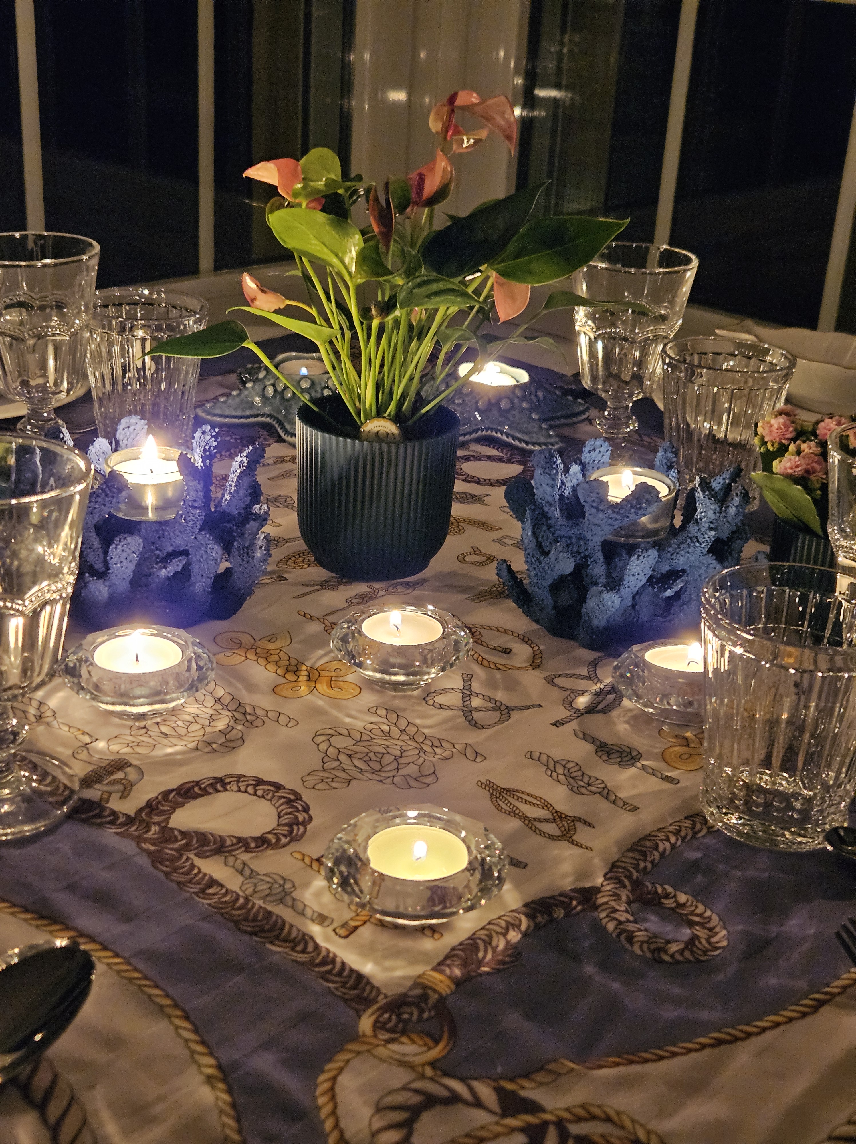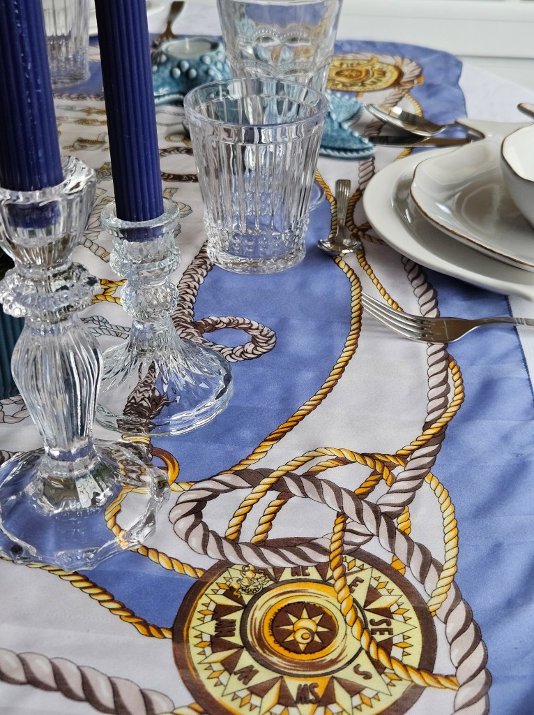 Sobre la mesa, el pañuelo de seda despliega un mapa sutil del océano: bordes azul marino, centro marfil, y una danza de nudos marineros que hablan de travesías, vientos y rutas invisibles. Como ecos del puerto, pequeños maceteros azul profundo sostienen flores ligeras, frescas como espuma. Los platos en forma de peces nadan entre detalles marinos: velas altas, estrellas de mar y corales azul marino sostienen velas pequeñas. La luz baila suave sobre la seda, y todo susurra a brisa salada. Una mesa que ancla la elegancia en lo esencial y navega entre texturas, memoria y mar.