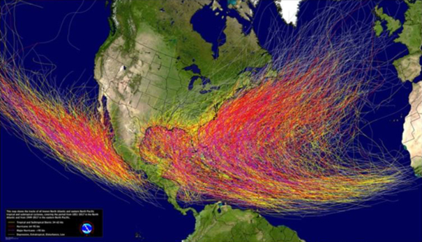 Es muy habitual en esta época escuchar en los medios de comunicación que, como consecuencia del cambio climático, está aumentando la frecuencia y la intensidad de los fenómenos meteorológicos extremos. Uno de ellos son los ciclones tropicales, que reciben diferentes nombres según su distribución geográfica: huracanes, en el Atlántico y en el Pacífico Oriental; tifones, en el Pacífico Central y Occidental; y ciclones, en el Océano Índico. La Figura 1, a continuación, muestra la trayectoria seguida por el enorme número de ciclones tropicales ocurridos en el Atlántico Norte (desde 1851) y en el Pacífico Norte Oriental (desde 1949).