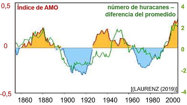 Del mismo modo, la AMO ejerce una influencia significativa en el desarrollo de los huracanes. Si analizamos el número de huracanes ocurridos después de la Pequeña Edad de Hielo, entre 1856 y 2005 (ver Figura 2), se puede comprobar que su frecuencia evoluciona siguiendo los ciclos de la Oscilación Multidecadal Atlántica. En la misma gráfica se observa también que el promedio de número de huracanes por década no ha aumentado significativamente durante el siglo XX, a pesar de las informaciones que al respecto aparecen en los medios de comunicación, especialmente al final de cada verano.