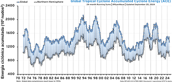 Otro parámetro importante para caracterizar los huracanes y ciclones tropicales es la medida de la energía ciclónica acumulada (ACE Accumulated Cyclone Energy en inglés). La energía liberada por los ciclones se estima con base a su duración, velocidad y otros parámetros. La Figura 3 muestra la evolución de la ACE (a nivel global y para el hemisferio norte) desde los años 70 del pasado siglo. La gráfica no muestra ningún aumento en la ACE en los últimos 52 años, sino una tendencia periódica de altibajos con un patrón similar a la evolución de la Oscilación Meridional de El Niño (ENSO El Niño Southern Oscillation en inglés). Es evidente pues que las oscilaciones oceánicas tienen una gran influencia en el desarrollo del clima y la formación de ciclones tropicales y es de esperar que investigaciones futuras sobre la ciclicidad de la actividad solar y su influencia en los fenómenos meteorológicos contribuya significativamente a refinar los modelos climáticos actuales.