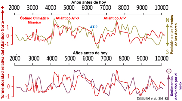 Se ha interpretado que las fluctuaciones en la intensidad de las tormentas influyen en los regímenes de precipitación del norte de Europa. Como se muestra en la Figura 4, puede existir una relación con los cambios en la posición e influencia delos anticiclones de las Azores y el vórtice polar (panel superior de la Figura 4). Estos dos fenómenos atmosféricos, que tienen gran importancia meteorológica y climatológica en el Atlántico Norte, están controlados por las oscilaciones oceánicas, que a su vez dependen de la energía solar incidente. En la gráfica inferior de la Figura 4 se observa también como existe una correlación entre el transporte de sedimentos a través de los iceberg (sedimentos derivados por el hielo) y la intensidad de las tormentas. No deja de ser sorprendente que los periodos de máxima intensidad de tormentas coincida con los óptimos climáticos del Atlántico y del Período Minoico.