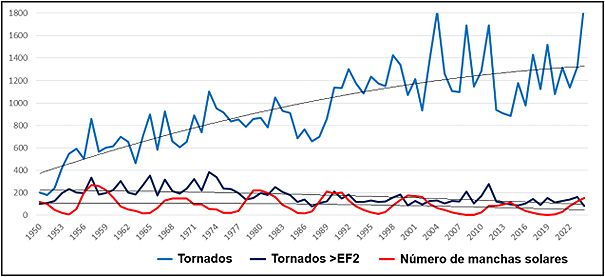 La gráfica de la Figura 5 muestra claramente que el número total de tornados anuales ha aumentado durante el período mostrado, mientras que el número de manchas solares ha disminuido ligeramente (línea roja). Sin embargo, es curioso que los tornados de mayor intensidad disminuyen ligeramente, sugiriendo que una menor intensidad solar favorece la formación de tornados, especialmente los tornados más débiles, mientras que los más violentos disminuyen. En cualquier caso, puede constatarse que, a pesar del calentamiento global (o quizás debido a él), el número de tornados devastadores en Estados Unidos ha disminuido a lo largo de los últimos 70 años.